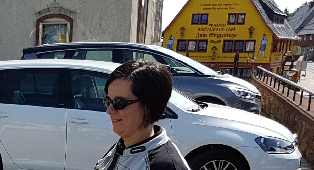 Nachdem Enrico fragt, ob wir einen Kaffee wollen fällt mein Blick zunächst auf das gelbe Gasthaus „Zum Erzgebirge“ hinter dem Parkplatz.