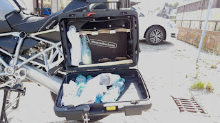 Für mich überraschend, für Enrico die Kundensicht konsequent zu Ende gedacht, hat er den linken Seitenkoffer seiner BMW 1200 GS zur Kaffee-Bar mit Flaschenhaltern ausgebaut und schenkt uns einen heißen Kaffee aus seiner Thermoskanne ein. Die Milch wird aus einer Bügelflasche serviert.