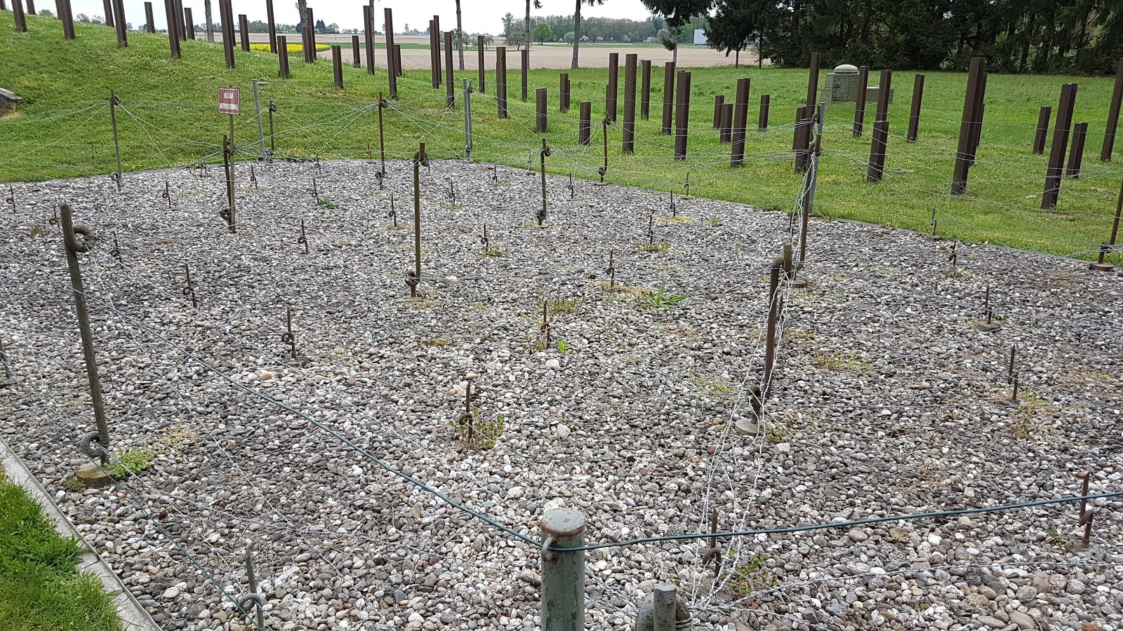 | Auf dem gezeigten Bereich ist ein Stacheldraht-Netz in verschiedenen Höhen gepsannt. |